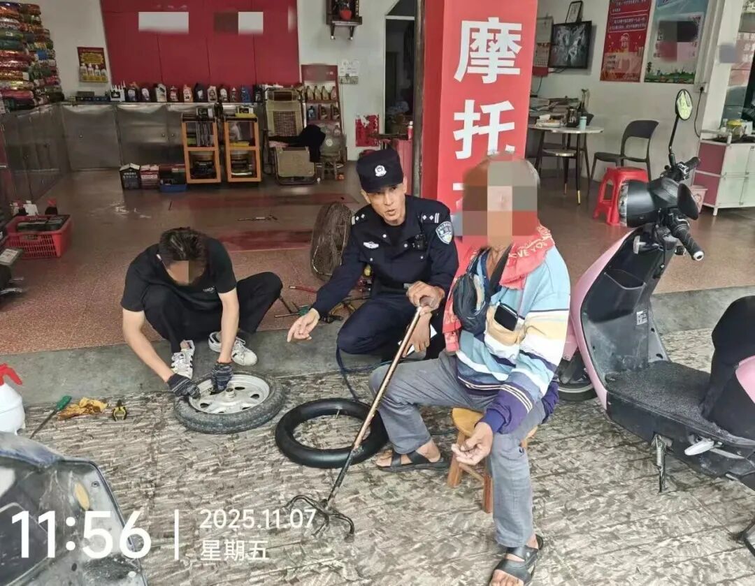 期间,民警还耐心告知车主出行注意事项,提醒其定期检查车辆状况,确保出行安全。三轮车更换好轮胎恢复正常行驶后,车主激动地说:“本来以为今天要被困在这里了,多亏了你们人民警察不仅帮忙修车,还自己花钱给我换轮胎,真是太感谢你们了!”。